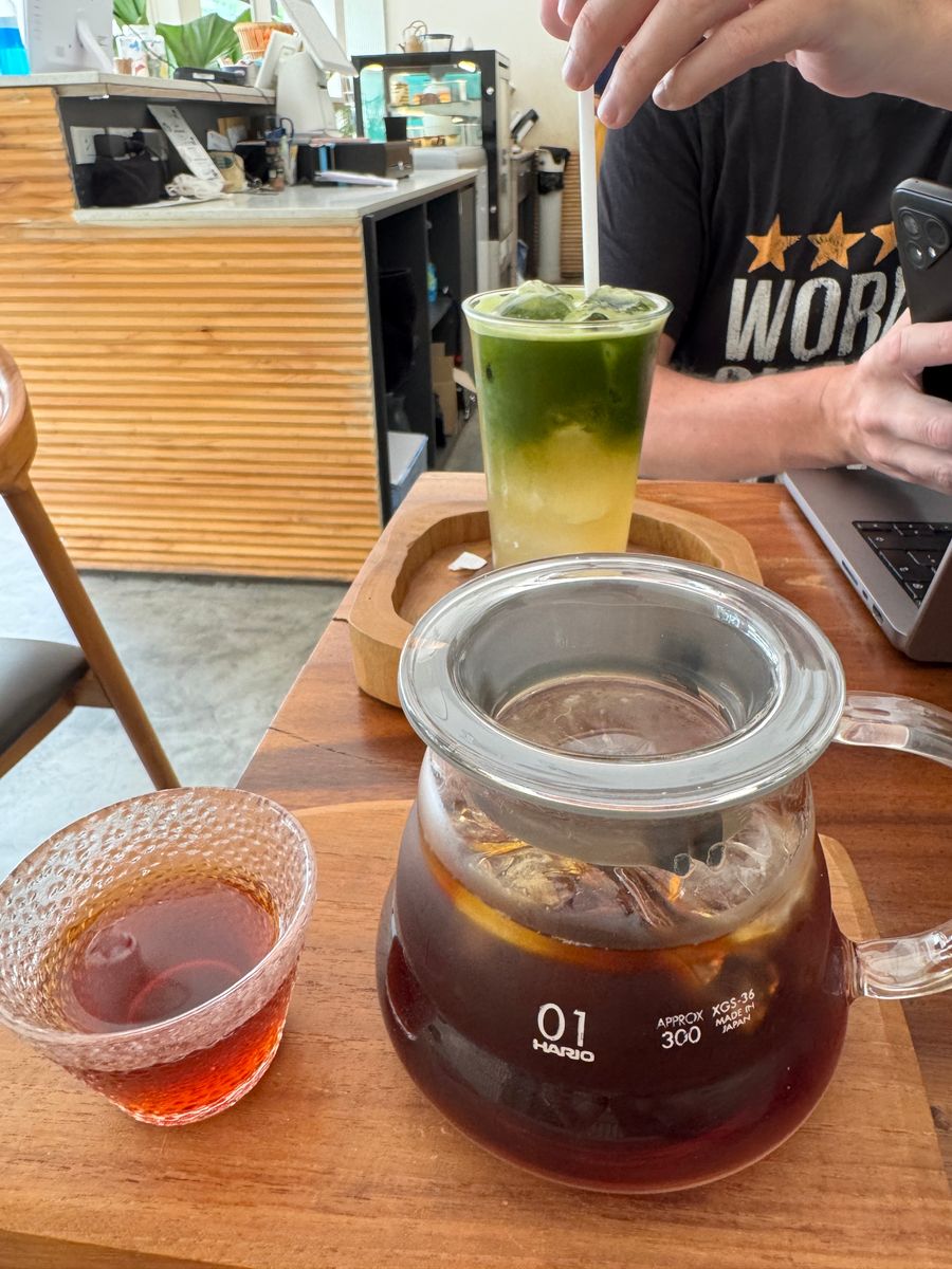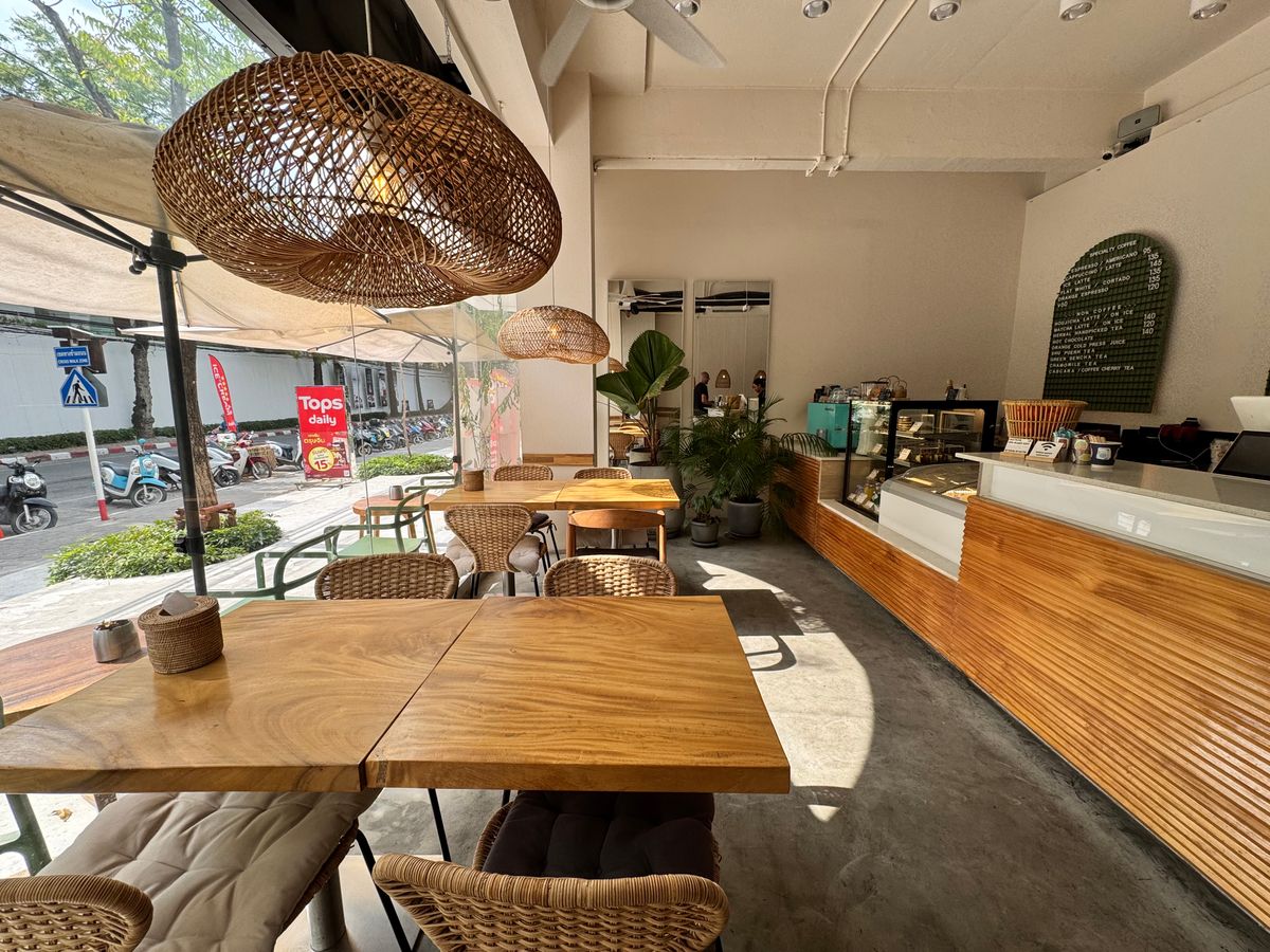 A cozy café located next to the SALA resort. They have a great selection of coffee drinks and delicious ice creams. The place was completely empty at 10 AM on a Monday so finding a seat is not a problem. There's wifi that's plenty fast but unfortunately only two power outlets by the wall so most seats don't have power. They're playing some very chill lounge music and since the café is almost empty it's very quiet. If you want to sit outside there's a few seats in front of the building, however they face a busy road and the sun is quite strong in the morning so staying indoors is probably better. Overall a nice place to relax and get some work done while enjoying good coffee and ice cream. Prices are reasonable, about 130 THB for a very large V60 pour over and 155 THB for a matcha lemonade.