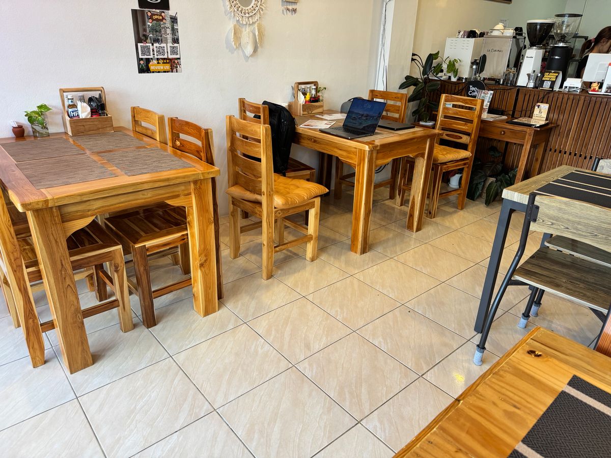 A relatively large café by Koh Samui standards with a total of 4 tables each seating 4 people. The café is located next to a large square making it slightly more quiet than most other cafés in the area which usually face busy roads. The Wifi is blazingly fast and the drinks are great with a huge selection of both hot and cold drinks as well as some cocktails and beers. They offer happy hour prices on alcohol from 3pm to 5pm. There's no power outlets so keep that in mind if you plan to stay longer, but you could probably ask the very nice owners to charge a device for a few minutes in a pinch. There's not much in the way of food other than a few cakes which all looked delicious.