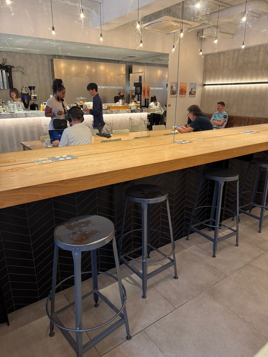 A good spot to work from near Akasaka and Akasaka-Mitsuke stations. Some tables and a long counter with power outlets.